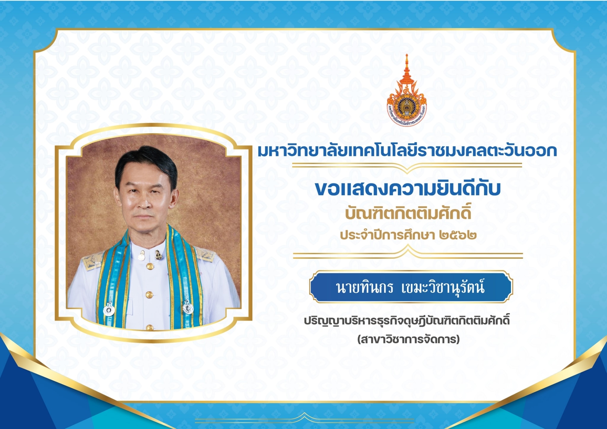 ซื่อสัตย์ เที่ยงธรรม เป็นกลาง ปราศจากอคติ มืออาชีพ โปร่งใสตรวจสอบได้ โดยได้รับเกียรติบัตรข้าราชการพลเรือนดีเด่น จากสำนักนายกรัฐมนตรี เมื่อปี พ.ศ. ๒๕๔๔ และอุทิศประโยชน์ให้แก่สังคม สภามหาวิทยาลัยเทคโนโลยีราชมงคลตะวันออก จึงเห็นสมควรมอบปริญญา บริหารธุรกิจดุษฎีบัณฑิตกิตติมศักดิ์ (สาขาวิชาการจัดการ) เพื่อเป็นเกียรติประวัติสืบไป