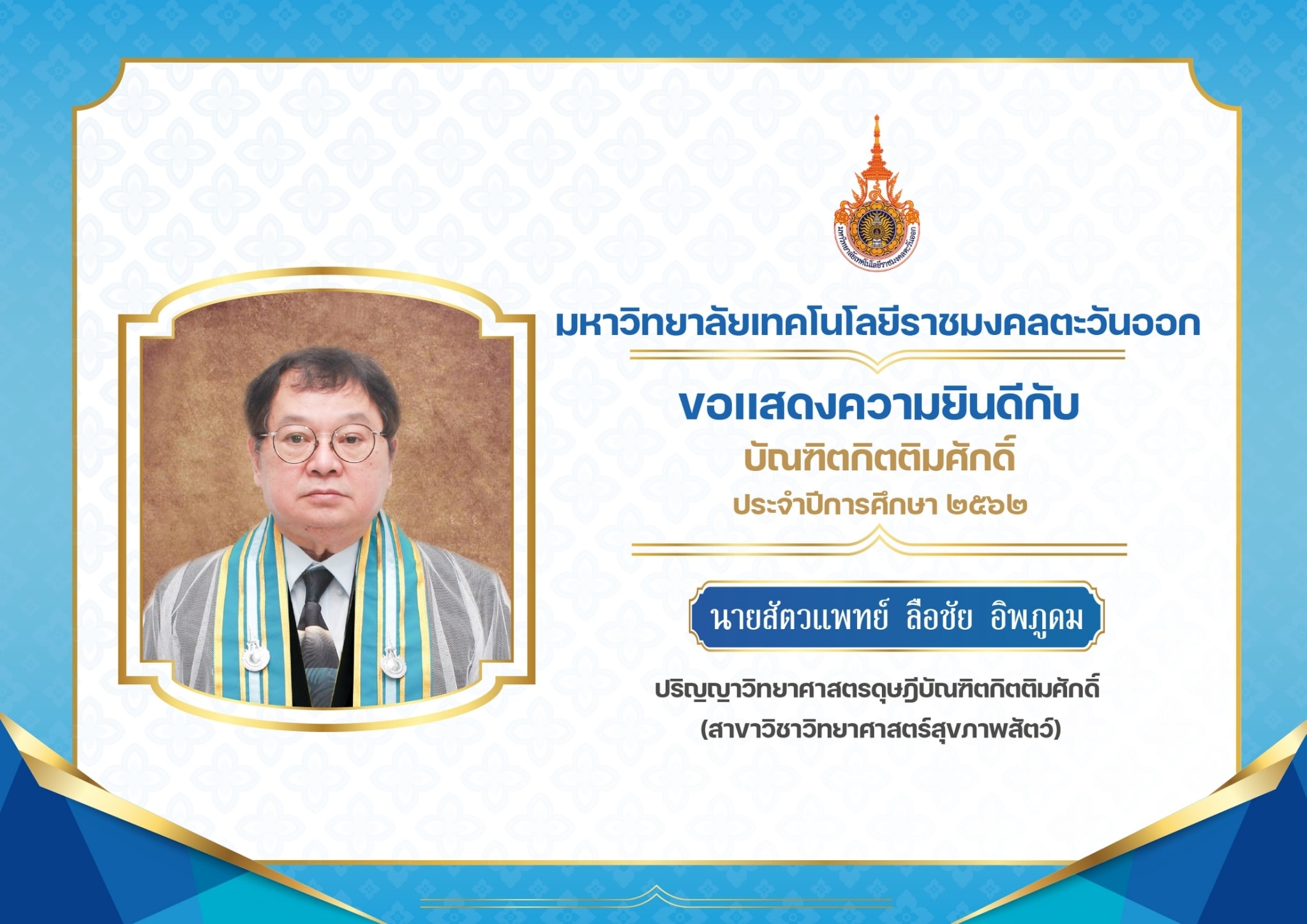 การอุทิศตนและเสียสละ การช่วยเหลือ รักษาสัตว์เลี้ยงในวงการ ปศุสัตว์ เป็นการสร้างประโยชน์แก่สังคม สภามหาวิทยาลัยเทคโนโลยีราชมงคลตะวันออก จึงเห็นสมควรมอบปริญญา วิทยาศาสตรดุษฎีบัณฑิตกิตติมศักดิ์ (สาชาวิชาวิทยาศาสตร์สุขภาพสัตว์) เพื่อเป็นเกียรติประวัติสืบไป